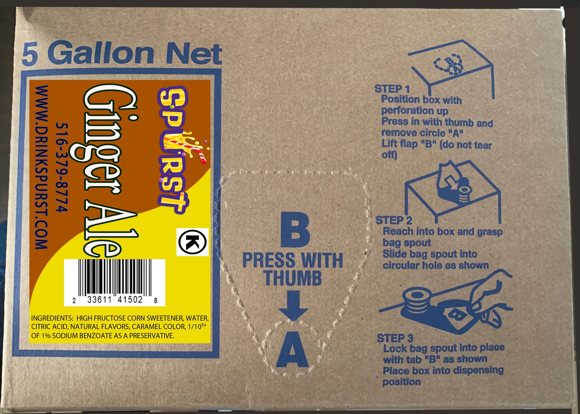 5 Gallon Bag in Box Ginger Ale Flavored Syrup. Save up to 400% over bottles and can beverages. Expert-grade syrup ideal for use in restaurant chains produces 30 Gallons of drinks. Ships to over 200 countries. See detailed specifications and place orders online.